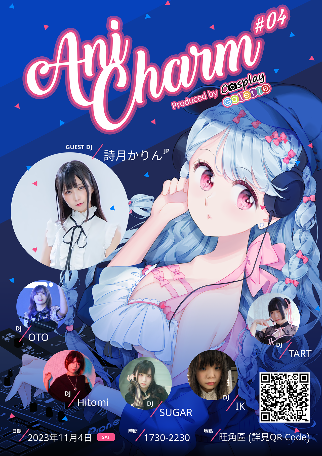 AniCharm #04 開催日: 2023年11月4日(土) 開催地: 九龍旺角登打士街43H號 達行商業中心13樓01-02室 開場:17:30 開演:18:10 主催: Cosplay Galerie チケット 前売り:HK$200 ($50チェキ券1枚付き) 当日: HK$250 ※上記集合写真1回とノンアルコール飲み物1杯付き 出演者 DJ 詩月かりん DJ HitominT (朔月ひとみ) DJ TART DJ OTO (緒音) DJ SUGAR DJ IK